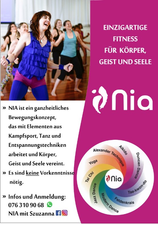 Nia (N = neuromuskuläre I = integrative A = Action) ist ein ganzheitliches Bewegungskonzept, das mit Elementen aus Kampfsport, Tanz und Entspannungstechniken arbeitet und Körper, Geist und Seele vereint.
